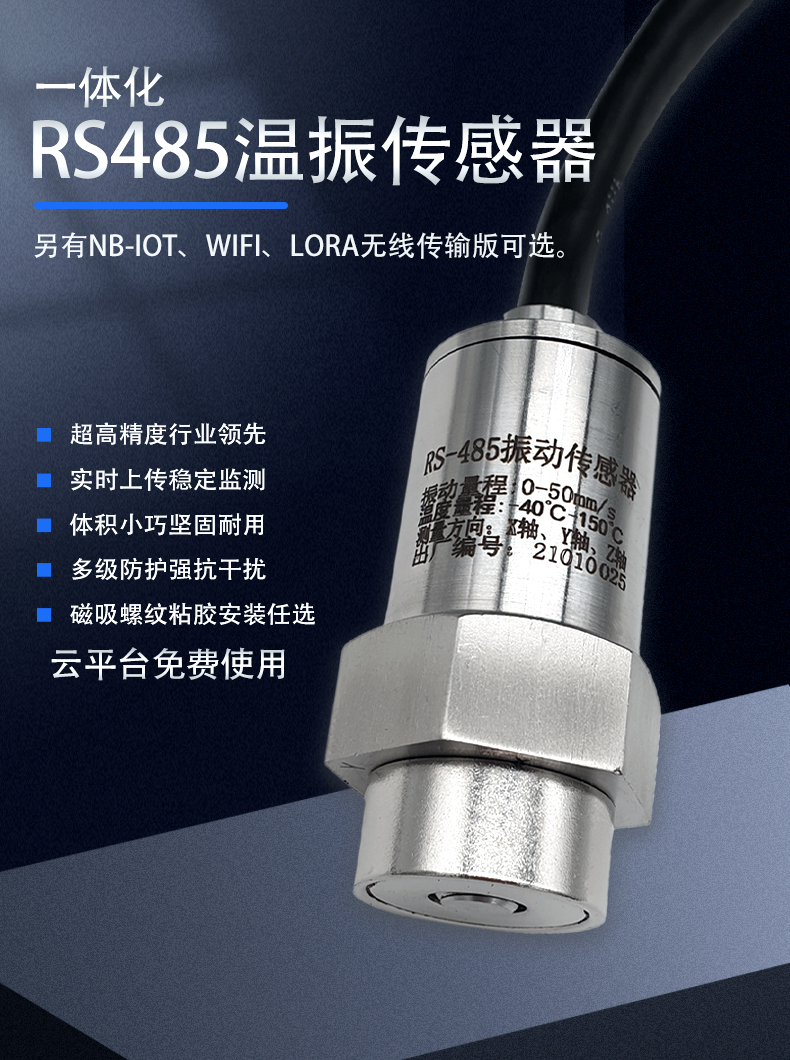 RS-485 振动传感器是选用高性能的 MEMS 芯片,采用嵌入式技术、温度传感技 术、振动传感技术开发生产的一款高性能、低功耗、抗干扰和复合型振动传感器。